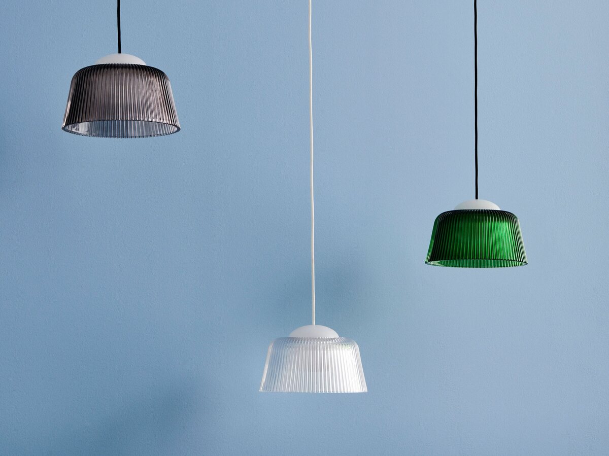 • The Brim Pendant Lamp by HAY features a fluted pressed glass shade that enhances light diffusion. Designed by Naoto Fukasawa, its compact size makes it ideal for hanging in clusters or individually in smaller spaces.