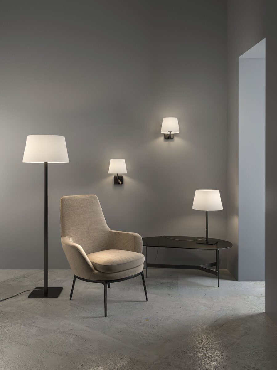 The Beaumont Reader Wall Lamp by Astro Lighting is designed for bedside use, featuring a compact die-cast zinc base with rounded corners. Its directional light and choice of fabric shade finishes make it a perfect reading companion.
